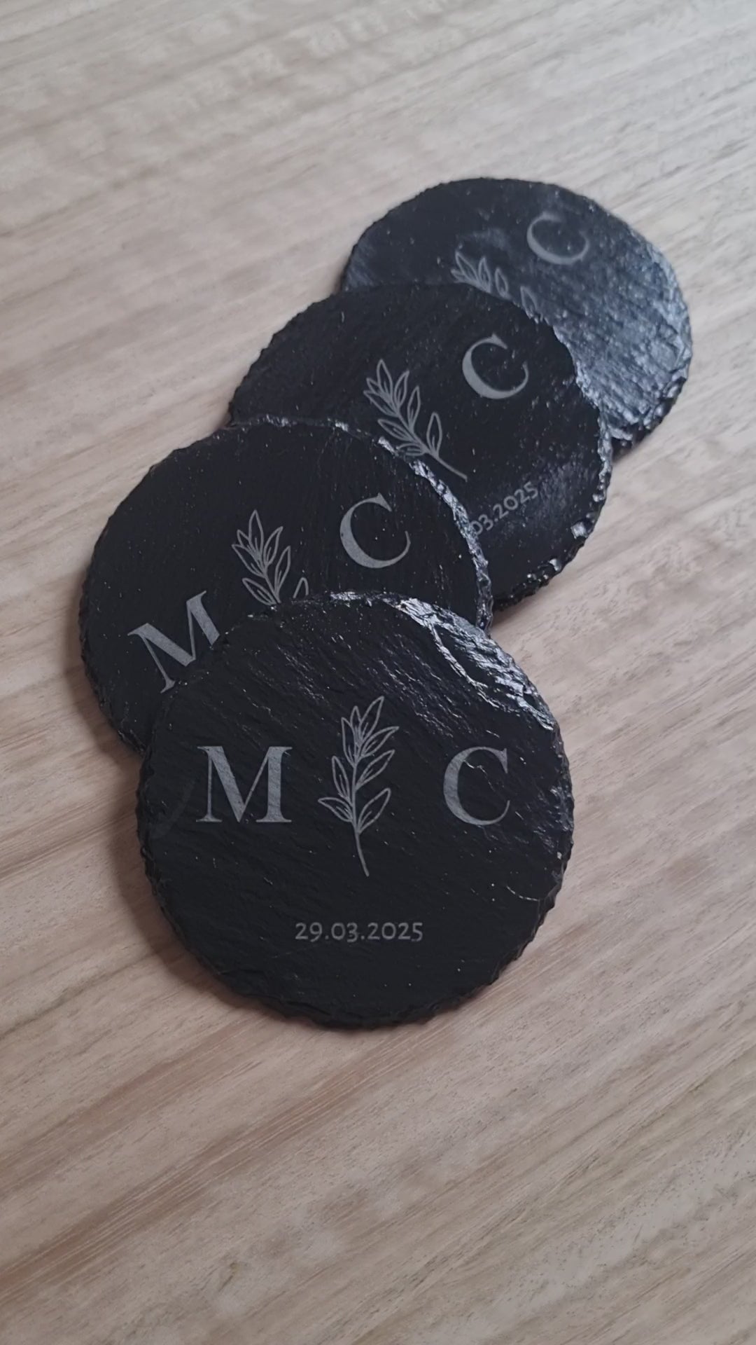 Set of round slate coasters with engraved botanical designs and name.