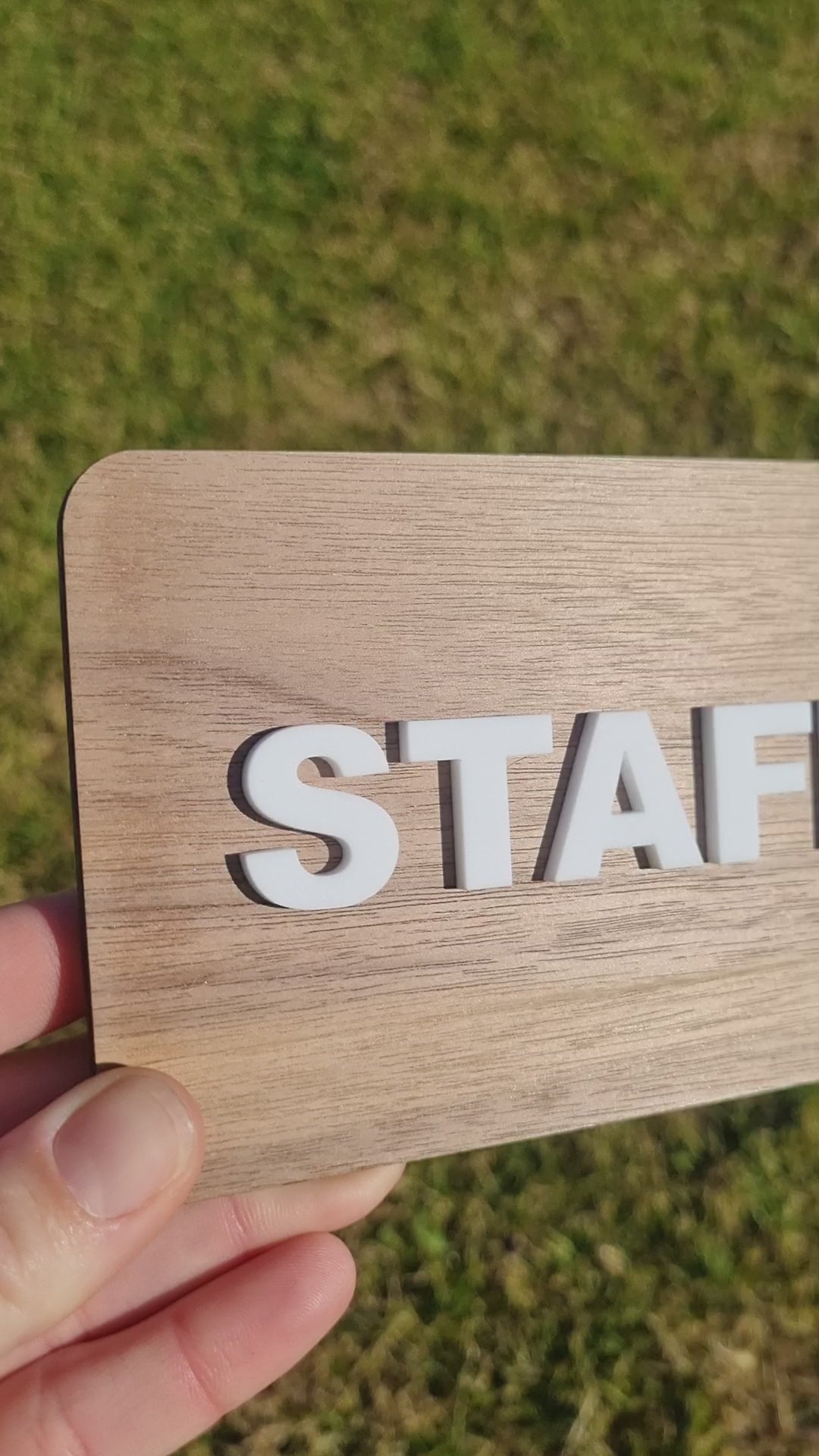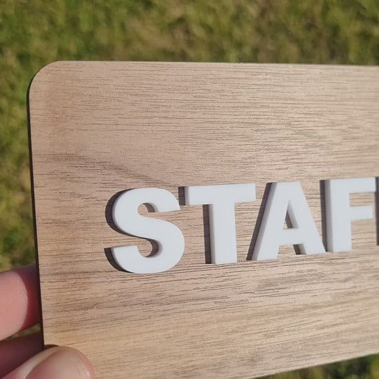 Modern STAFF ROOM sign with premium wood veneer and matte acrylic (gloss available upon request in the personalisation box).