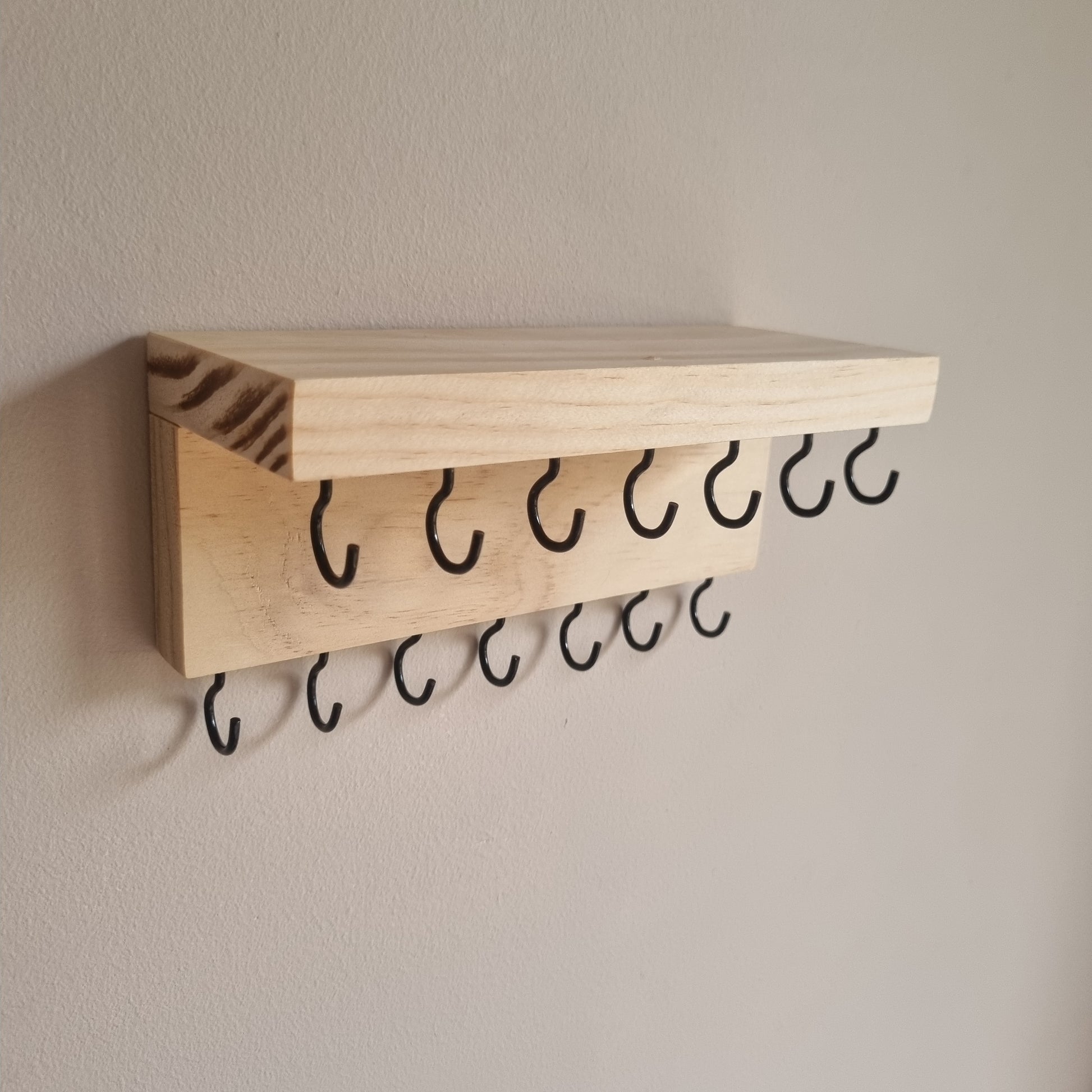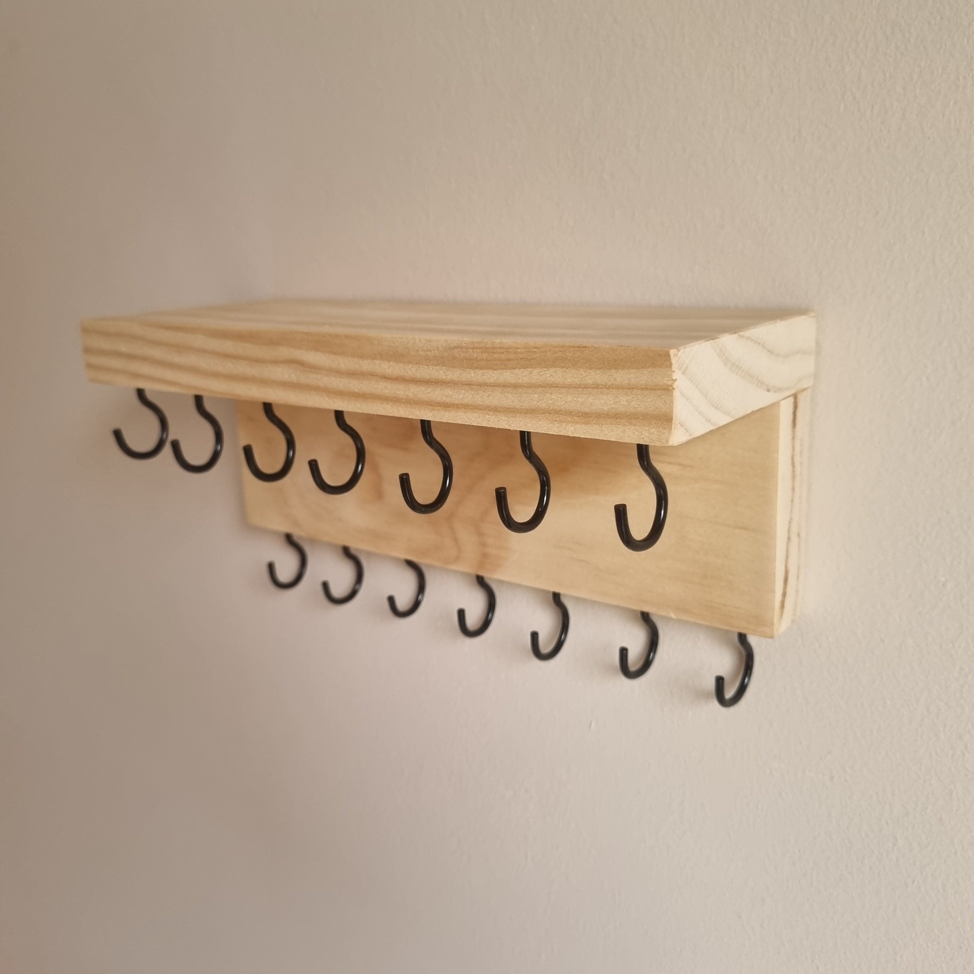 Dual row of hooks for extra space and a 7.5cm deep top shelf to put your watch, sunglasses, rings, or some decor items.