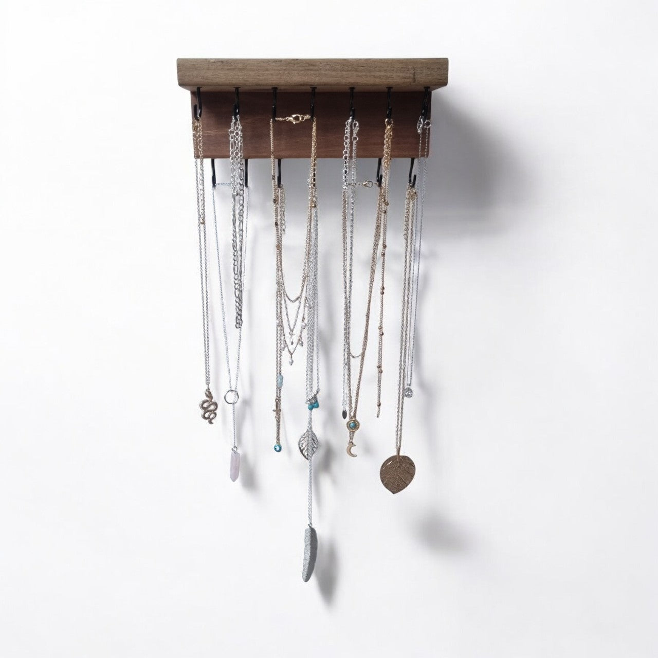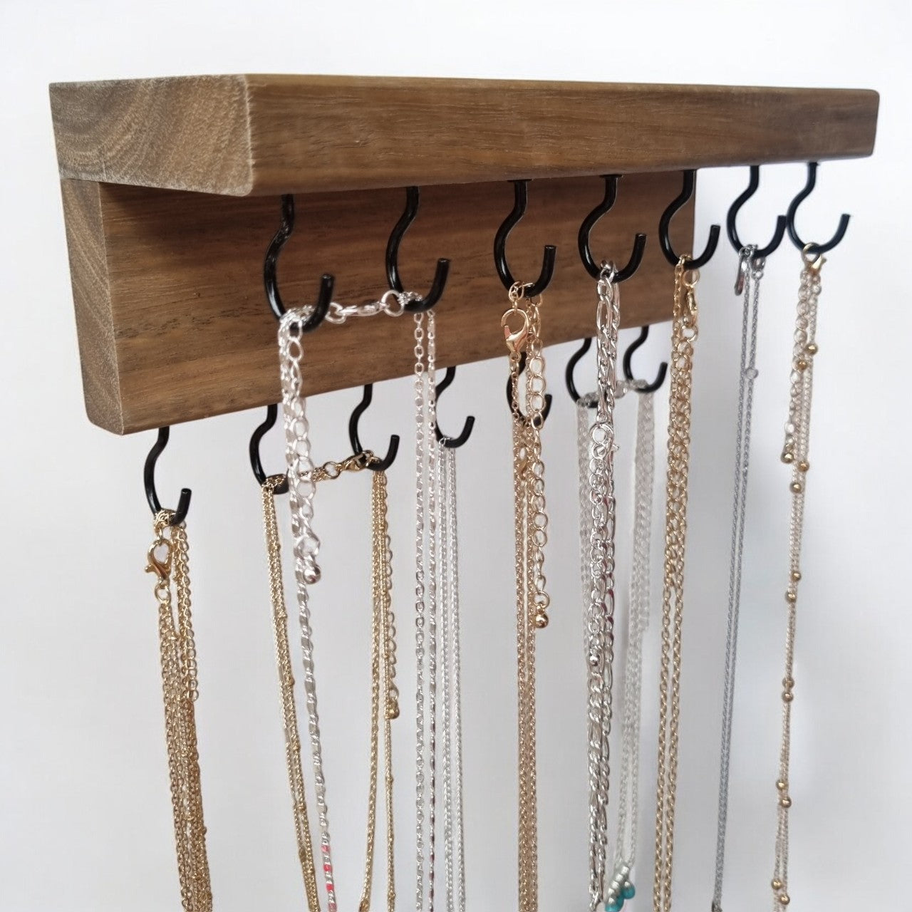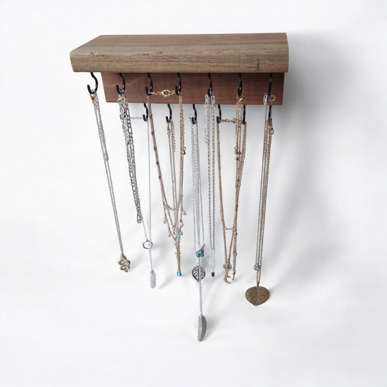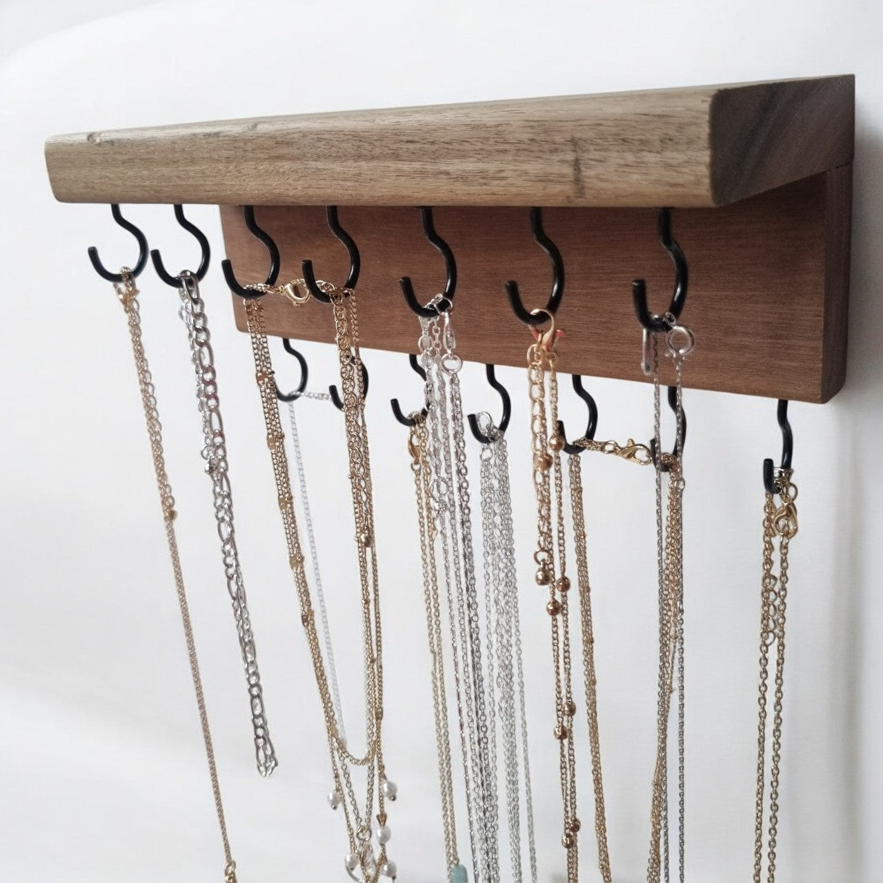 Handmade necklace holder, using locally sourced Australian solid timber and black metal hardware.